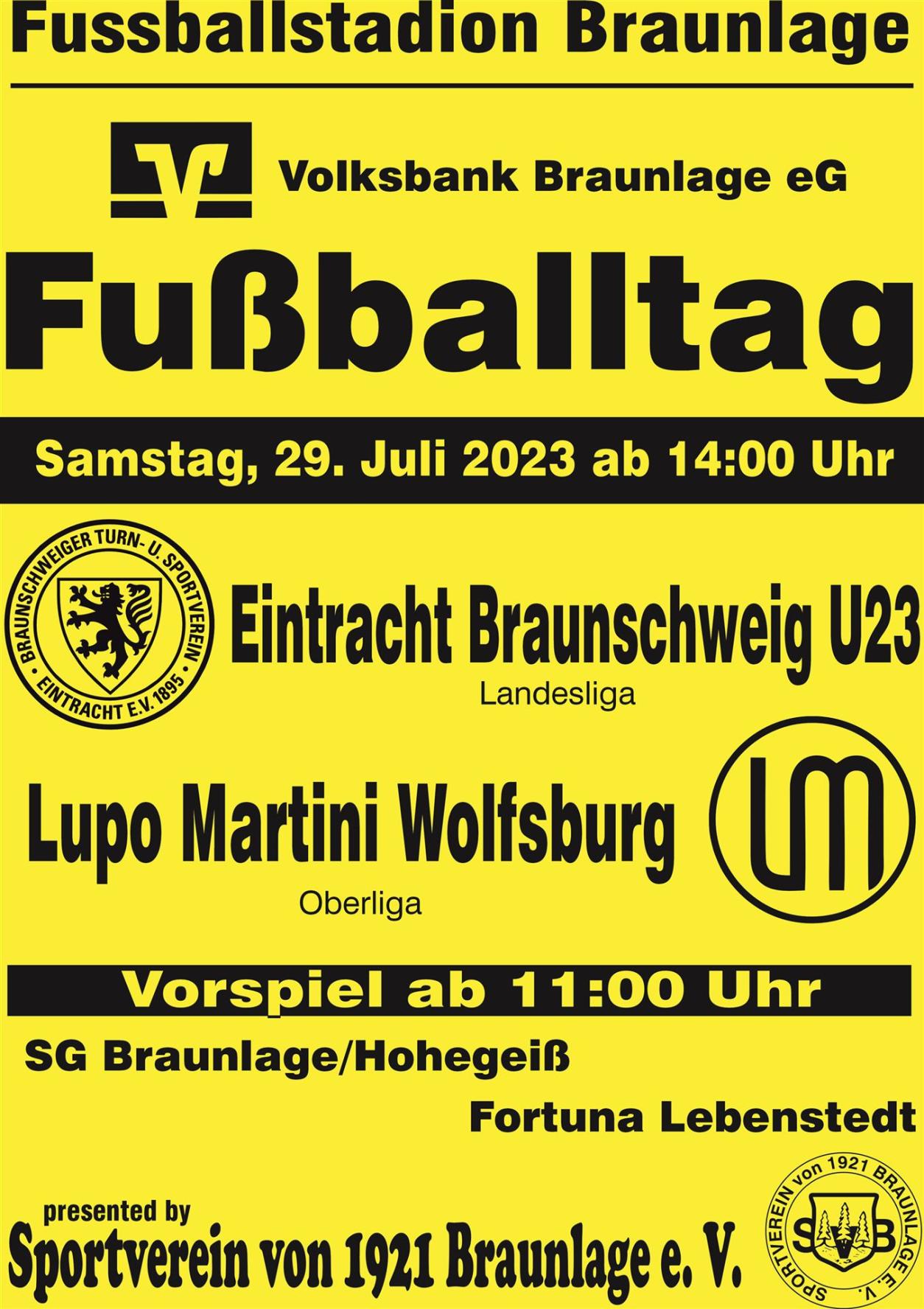 In einem Testspiel stehen sich um 14 Uhr der ambitionierte Landesligist Eintracht Braunschweig U23 und der in der Vorsaison nur knapp am Aufstieg gescheiterte Oberligist Lupo Martini Wolfsburg gegenüber. Für beide Mannschaften stellt dieses Match den Abschluss der Vorbereitung dar, am darauffolgenden Wochenende steht der Punktspielstart an.