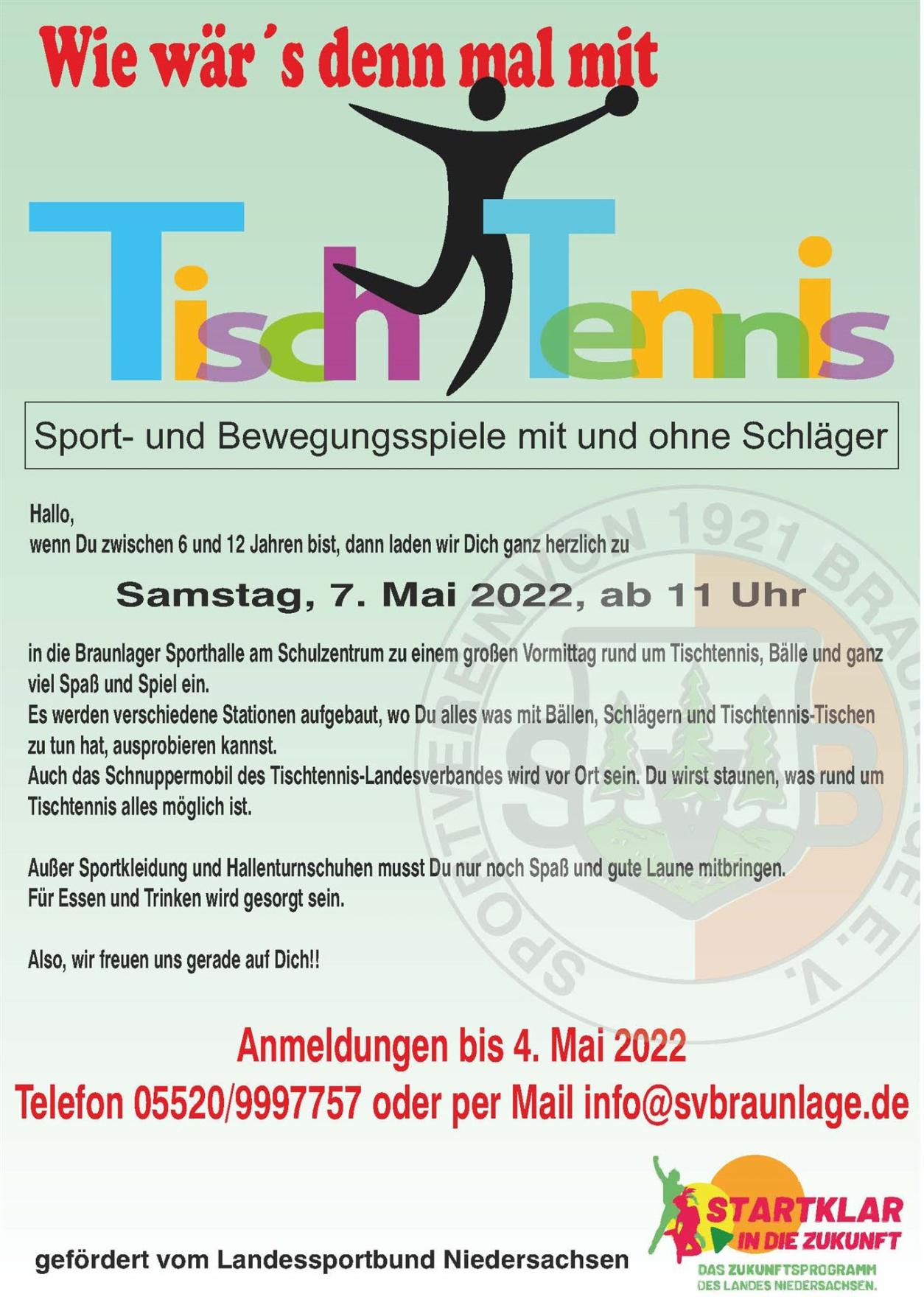 Der SV Braunlage lädt zum 7. Mai 11 Uhr in die Sporthalle Braunlage ein zu Sport- und Bewegungsspielen mit und ohne Schläger. Sogar das Schnuppermobil des Tischtennis-Landesverbandes wird mitwirken und eine interessante Landschaft in der Sporthalle schaffen.