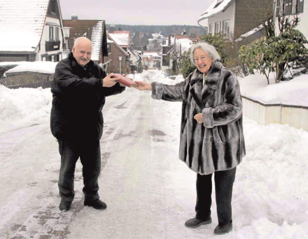 Isa Wickenhagen überreicht Vorsitzendem Eckart Kornhuber ein Album ihres Vaters mit historischen Unterlagen