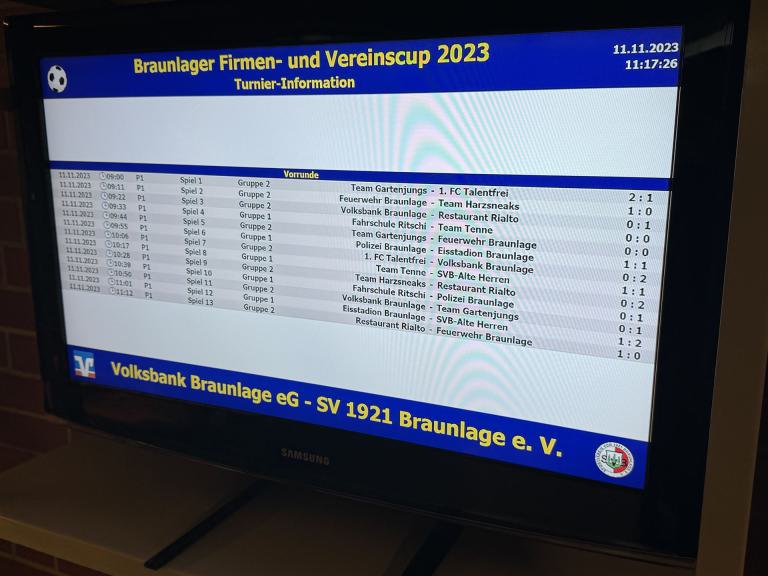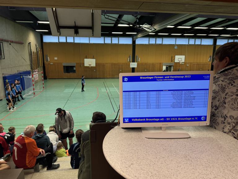 Nach achtjähriger Pause fand am 11. November 2023 wieder der Firmen- und Vereinscup in der Sporthalle statt. Die Organisation übernahmen diesmal ein Team aus der Volksbank Braunlage, die in diesem Jahr ihr 100. Jubiläum feiert, und des Sportvereins Braunlage. Bankvorstand Kai Engelhardt und Vereinsvorsitzender Eckart Kornhuber freuten sich bereits zu Beginn des Turniers über das gute Meldeergebnis, hatten sich doch elf Mannschaften angemeldet und nahmen den Wettstreit um den von der Volksbank neu gestifteten Wanderpokal auf.